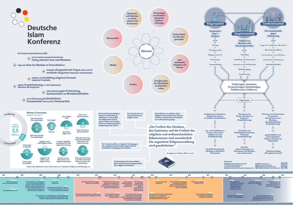 Die Deutsche Islam Konferenz hat sich seit 2006 mit einer Vielzahl von Themen beschäftigt. Zahlreiche Ergebnisse und Empfehlungen wurden in den letzten Jahren veröffentlicht; vom islamischen Religionsunterricht an staatlichen Schulen über islamische Wohlfahrtspflege und Seelsorge bis hin zum Moscheebau.