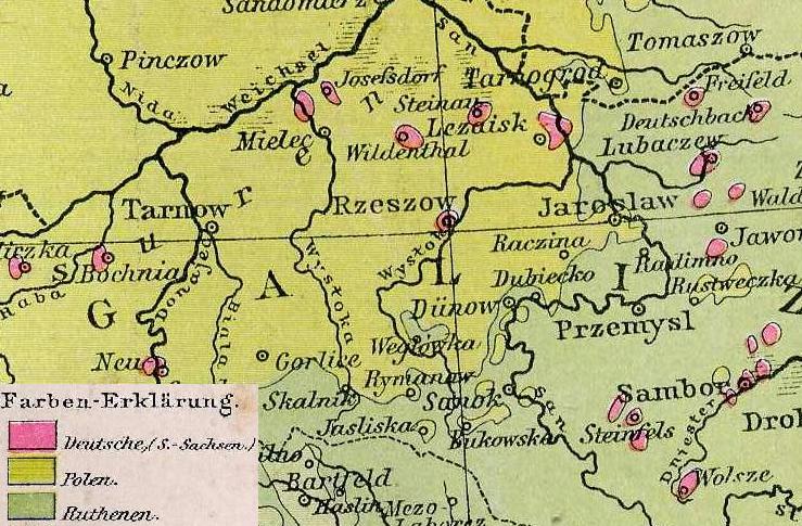Galiziendeutsche Sprachinseln auf dem heutigen Gebiet der Ukraine, ethonographische Karte von Österreiche-Ungarn (Galizien) von 1880. Foto: Wikipedia gemeinfrei