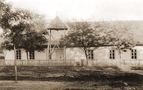 Bethaus von 1903 mit Glockenstuhl (gleichzeitig auch Dorfschule) in der bessarabiendeutschen Siedlung Hannowka. Foto: Hilfskomitee d. Bess. Dt., Wikipedia gemeinfrei
